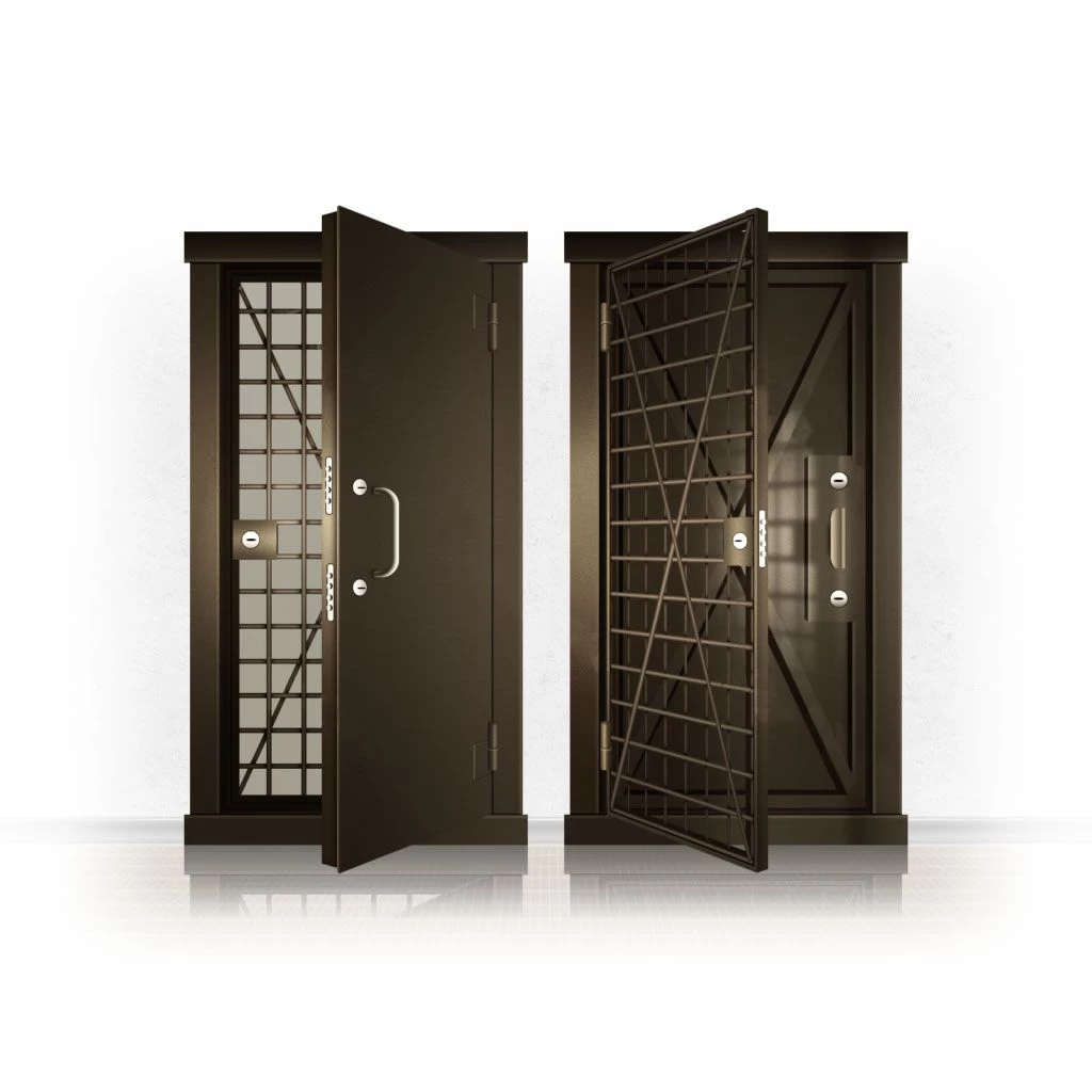 Металлические двери КХО и КХН представляют собой входные блоки, обладающие высоким уровнем взломостойкости и состоят из трех основных элементов: усиленного каркаса, сплошного металлического полотна и решетчатой двери. Дверной блок изготавливается из стального уголка 100*100 мм. Места крепления блока к стене цементируются и закрываются стальными наличниками шириной 40 мм. Крепеж заходит вглубь стены на 80 мм. В конструкции внешней створки монтируются ребра жесткости, для обшивки используется сталь толщиной не менее 3 мм. Внутренняя решетка изготавливается из прутка диаметром 16 мм. Размер ячеек решетки должен составлять не более 15 на 15 см. В точках пересечения прутья надежно приваривают друг к другу. В КХО и КХН необходимо поддерживать определенную температуру и влажность. Для этого внутреннее пространство глухой двери заполняется теплоизоляционным материалом, а по периметру двери приклеивается уплотнитель. Такие двери оборудуются замками с повышенным уровнем взломостойкости. Специализированные двери КХО и КХН в Щучье могут быть оснащены сигнализацией, в конструкции могут быть проушины для навесного замка и элементами для опечатывания. Если идет речь о двери в комнату хранения оружия, в створке оборудуется окно для выдачи оружия и спец. средств, которое накрывается стальной дверцей.